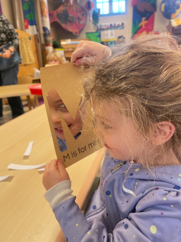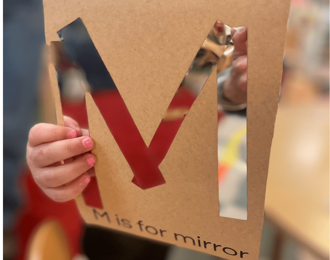 A mirror sticker! She was afraid that it came from somebody’s project, but after checking everyone’s projects, they all had four mirror stickers to make their M so we determined it must’ve been an extra one.