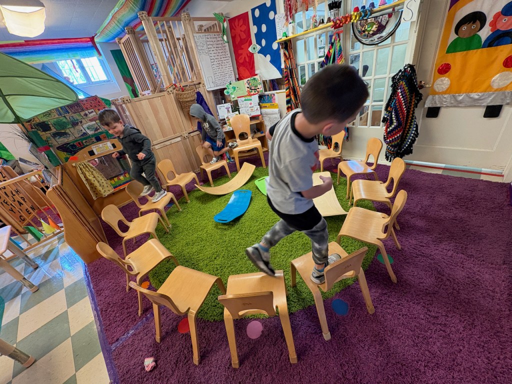 Today when children arrived, there were chairs at Circle Time…how interesting! They could walk on them and then we used them for a Circle Time game…read on to find out why.