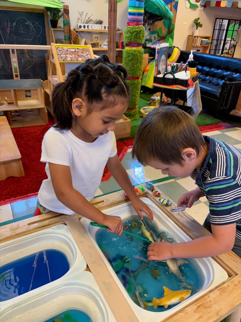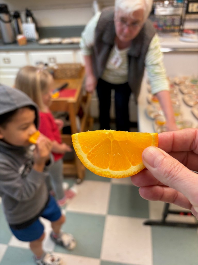 At Snack Time we had little paper umbrellas to make our water cups look fancy or to poke our food with. Children could eat snack at any of the tables today!