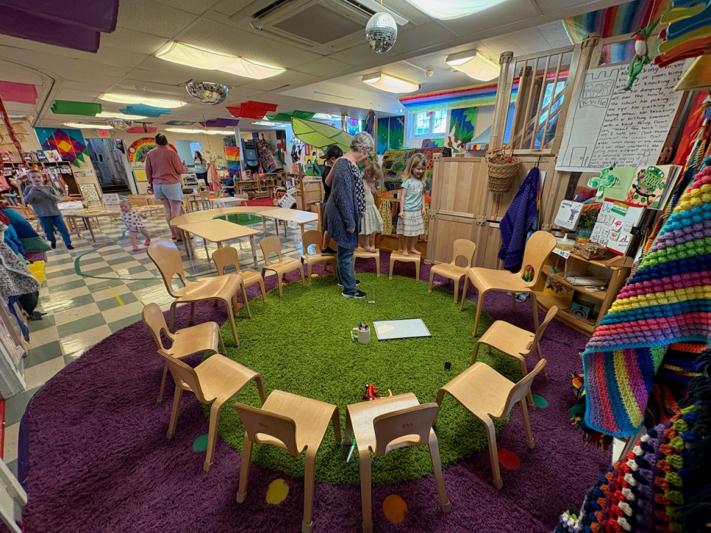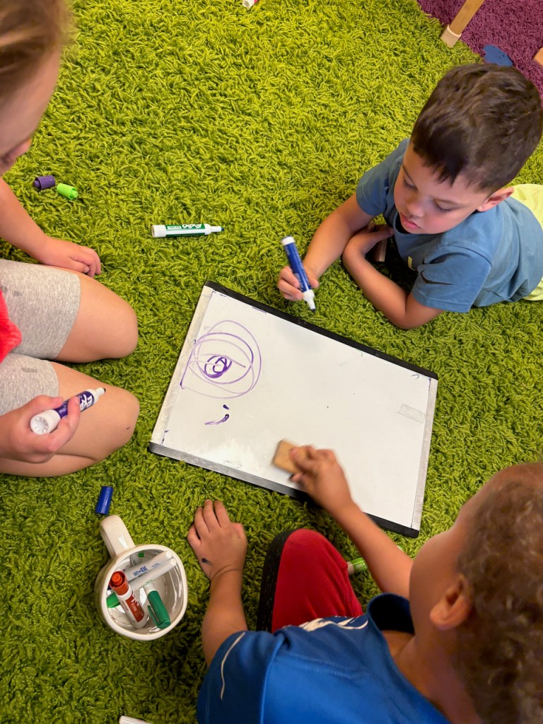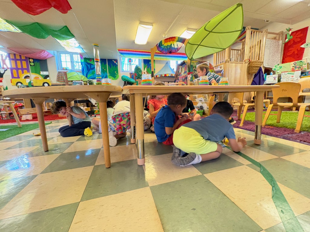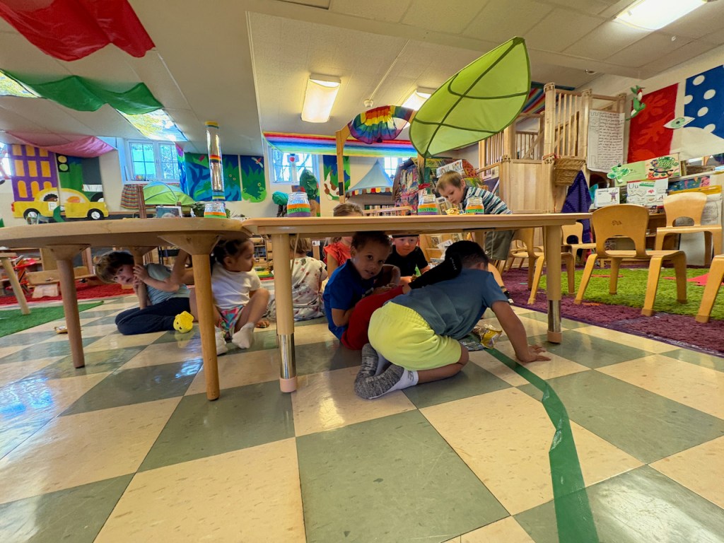 New things in the classroom for U Week: the tables are rearranged and children are invited to go under them: they did it by crawling or using scooters!