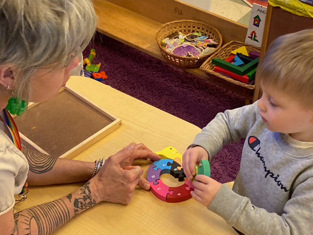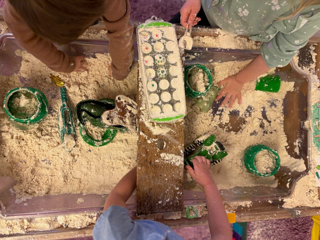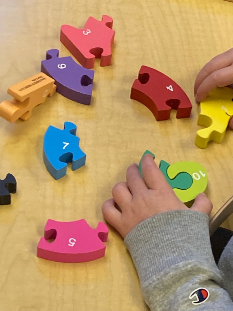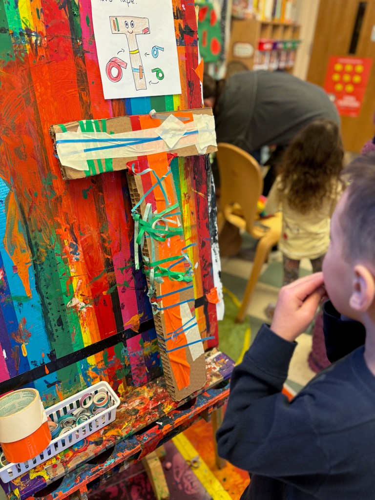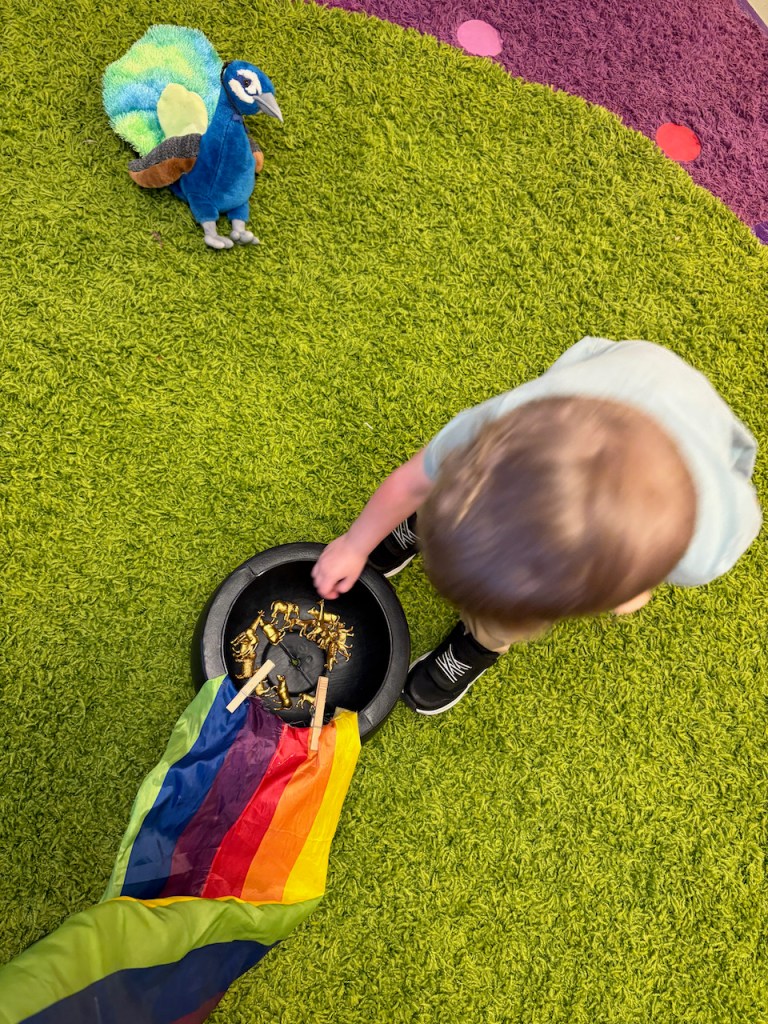 This week we are celebrating the letter T and St Patrick’s Day with Tom Tom the Leprechaun as our theme. This pretend character loves rainbows, the color green, gold and being outside in the trees. How fun that we still have a lot of green around since it is March’s Color of the Month: the playdough and tools are green, the Tub Table has green digging and sculpting tools, and all the Tiny Things. Our new Alphabet Friend is Terry who will be covered in tape this week! We have a pretend tornado that we can color and paint while it spins from a hook on the ceiling and a two tunnels to crawl through.