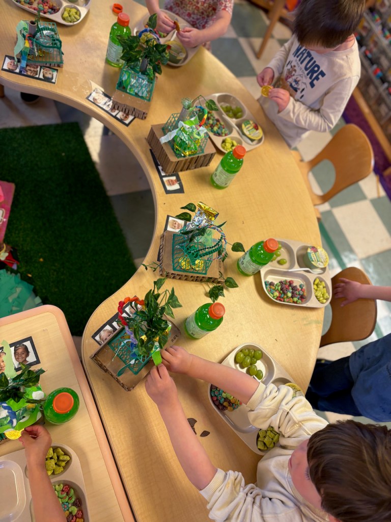 Morning class: We had green grapes, green cucumbers and rainbow Rice Krispie treats from Everett. Heath brought gold animals for everyone to choose. What a party! Thank you, Everett and Heath!