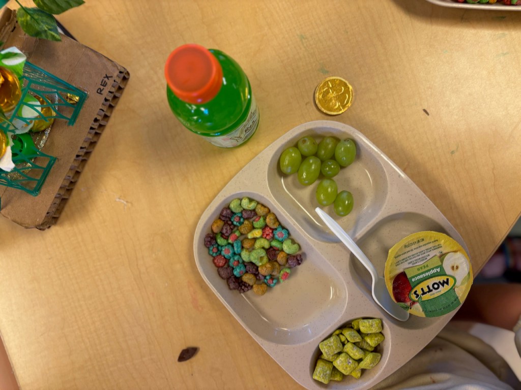 Afternoon class: We had green Gatorade, green puppy chow and green grapes from Avery and Axel. We had rainbow Trix cereal from Zander. Annie brought gold chocolate coins. Another great party! Thank you, Avery, Axel, Zander and Annie!