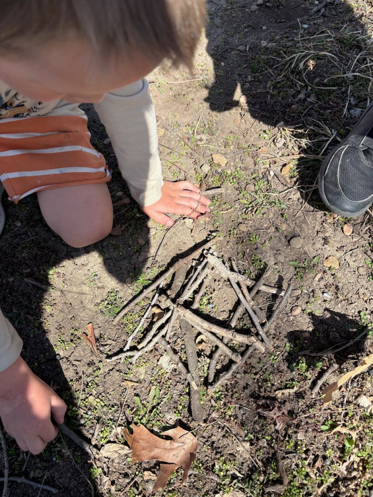 The cat! It was trying to get away from a dog! We looked at a lot of people and animals in A Tree is Nice and remembered Tom Tom’s love of the forest. On the same page we also noticed a child with a stick…we’re extra thankful for trees because they give us sticks!