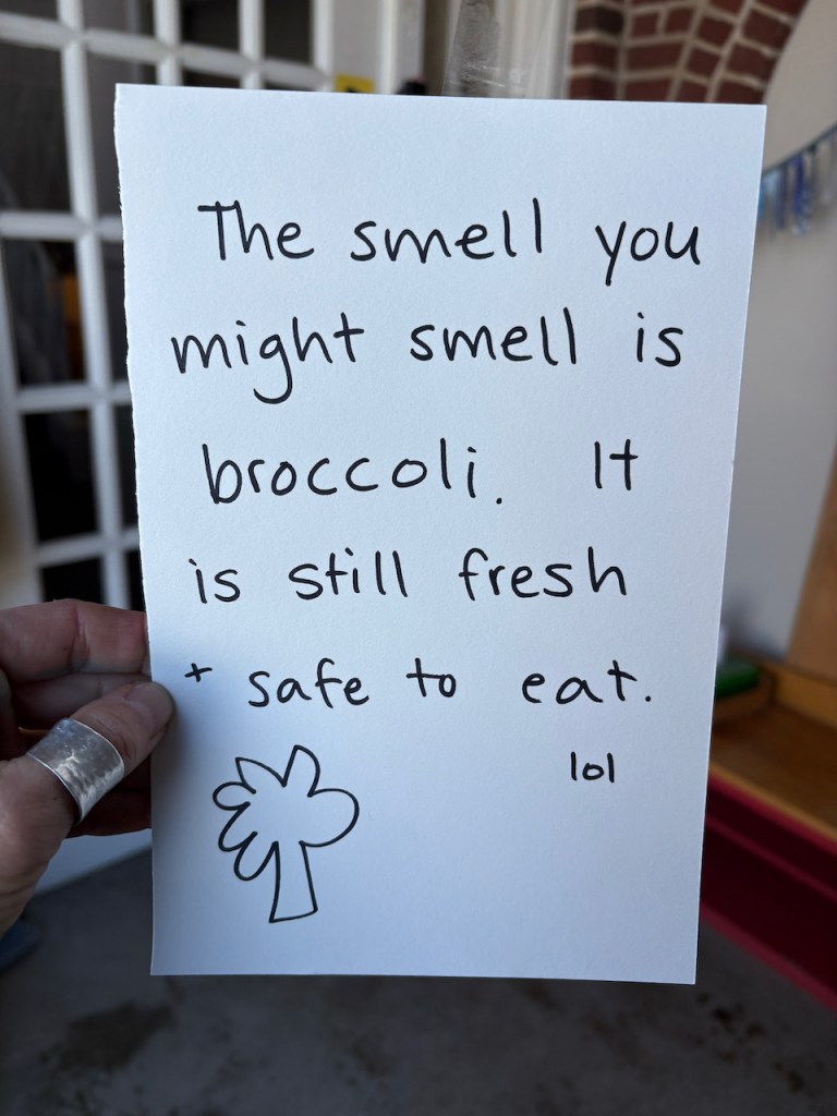 All week we will be offering fresh broccoli “trees” at snack time to remind us that newspaper and all paper originally came from trees. Fun fact: According to the latest data from the American Forest & Paper Association, around 65-69% of paper used in the United States in 2023 is made from recycled materials, meaning roughly 31-35% of paper is still produced from trees.