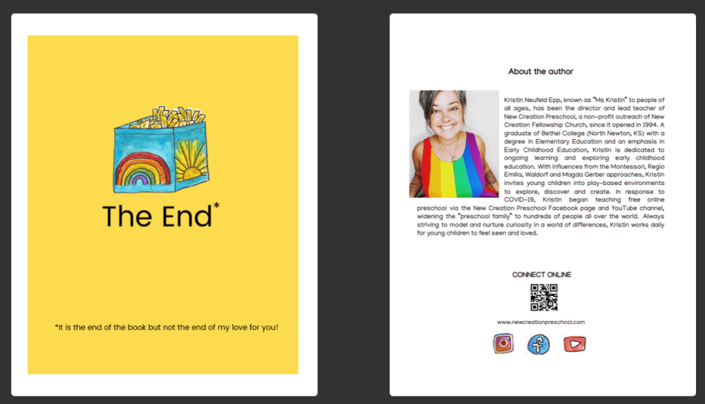 “New Creation Preschool has always been a lively and colorful place where children are invited to explore, discover and create. In operation since 1994, the classroom bustles with rainbows and children climbing on anything they are able to. On March 19, 2020 the decision was made to close the building in response to the Covid-19 pandemic. This book tells the story of how one little preschool shifted their program to an online platform. Once serving about 50 families from the local community, their online Circle Times and Zoom School sessions now reached hundreds of children.